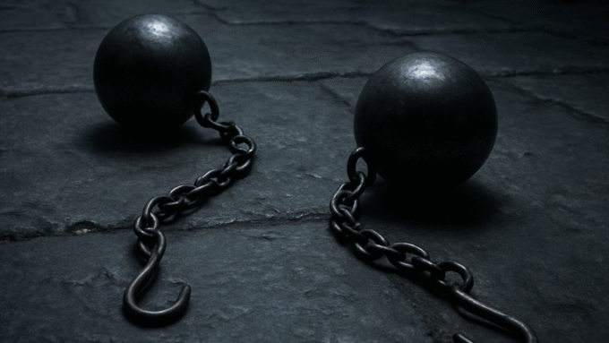 “Where do you think you’re going?” the guard asks the frantic prisoner struggling to get up.